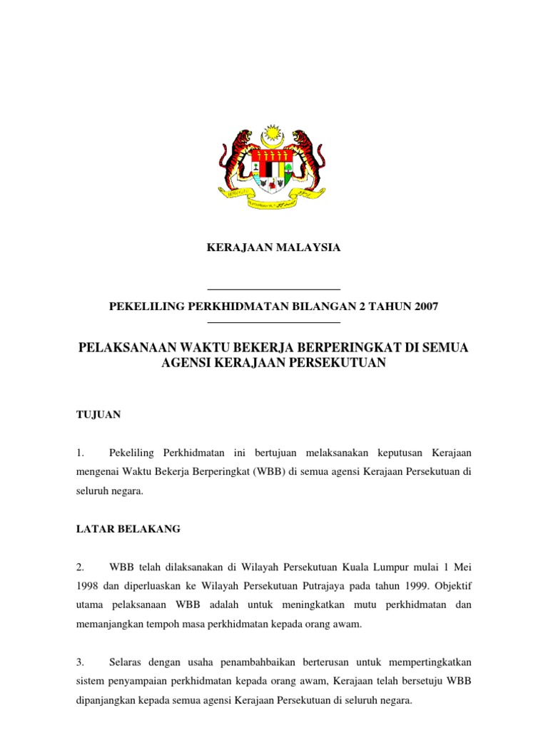 Pekeliling perkhidmatan ini bertujuan memaklumkan keputusan kerajaan untuk melaksanakan waktu bekerja fleksi (wbf) bagi menggantikan waktu bekerja berperingkat (wbb) di agensi kerajaan.